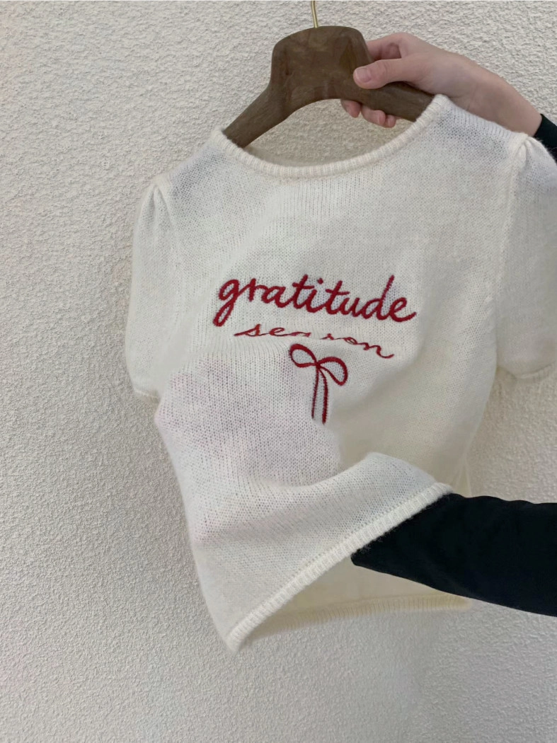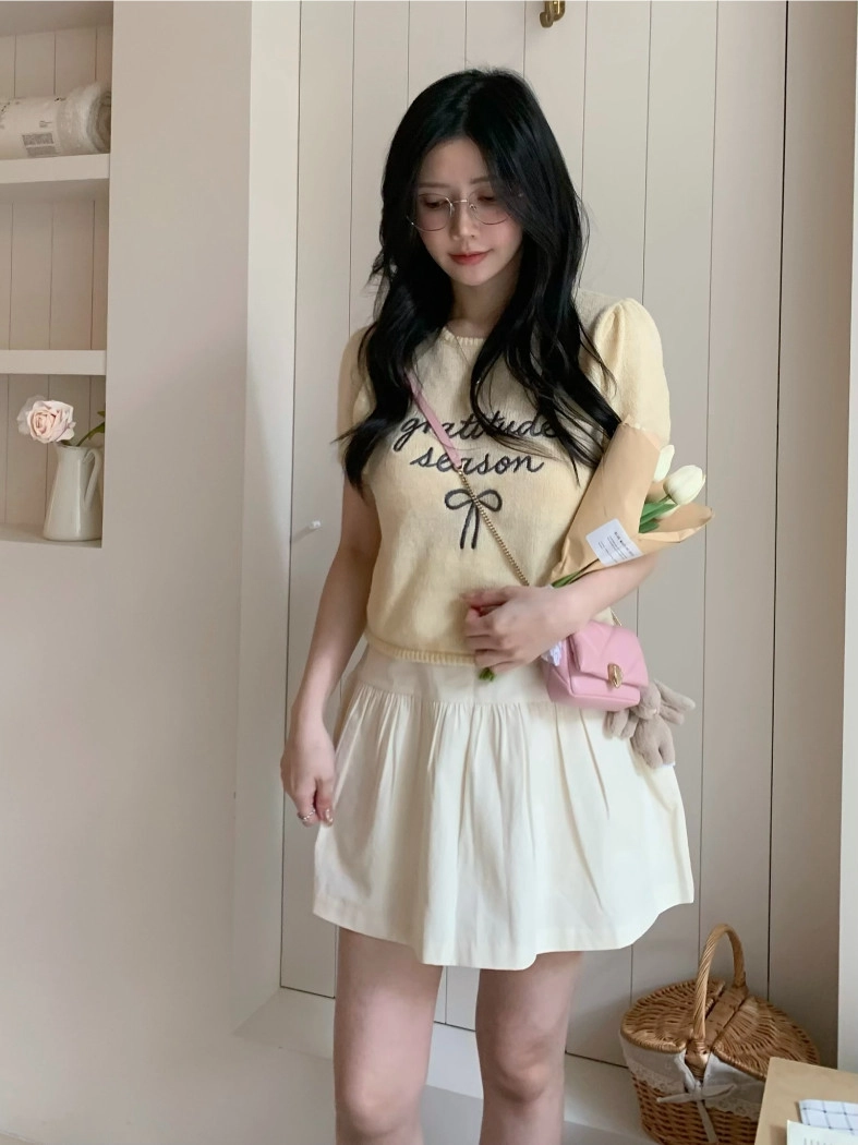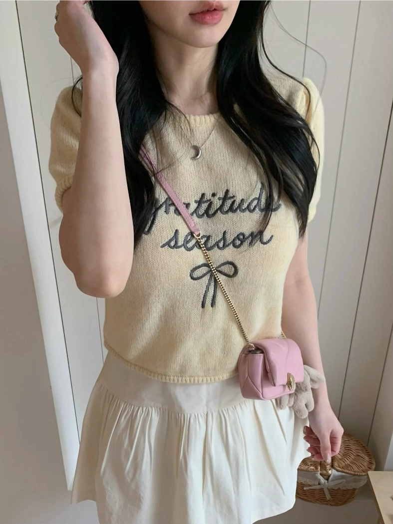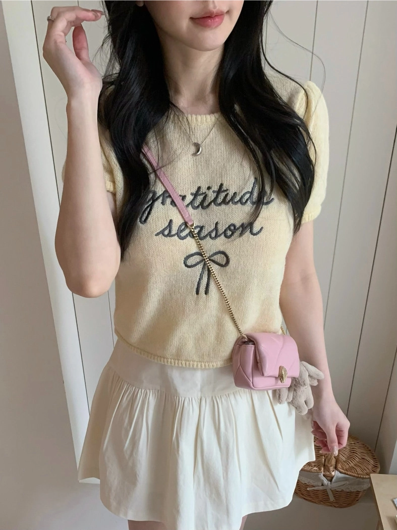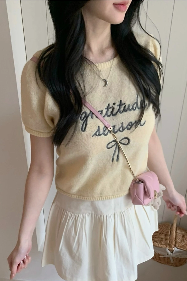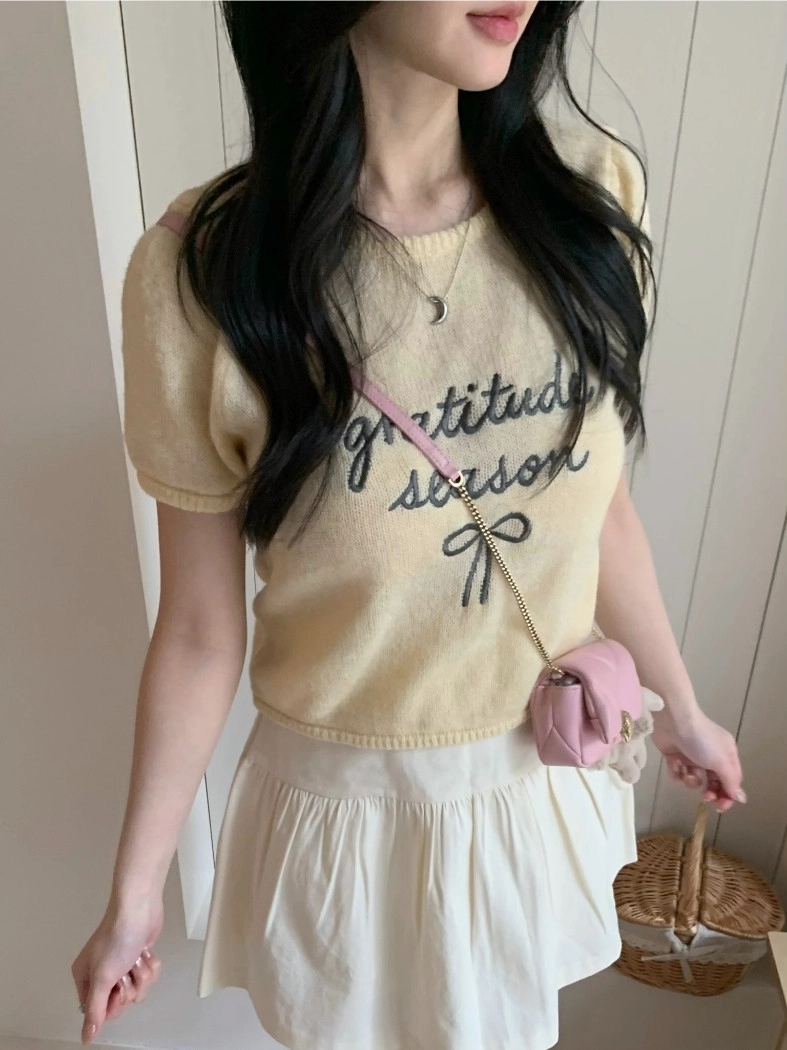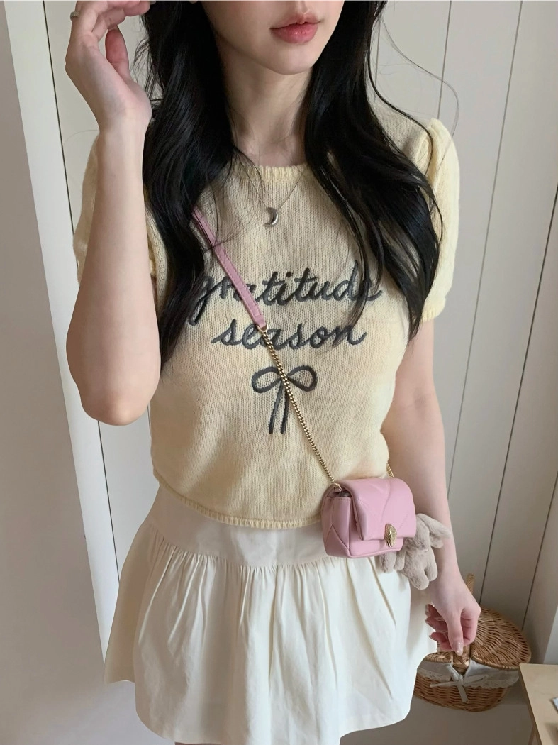 超超可愛薄針織刺繡圖案短版上衣(米白/黃/灰)