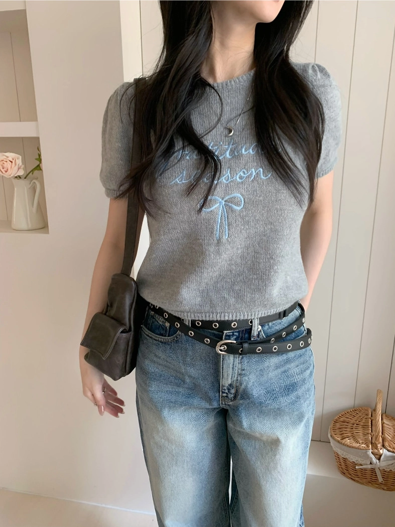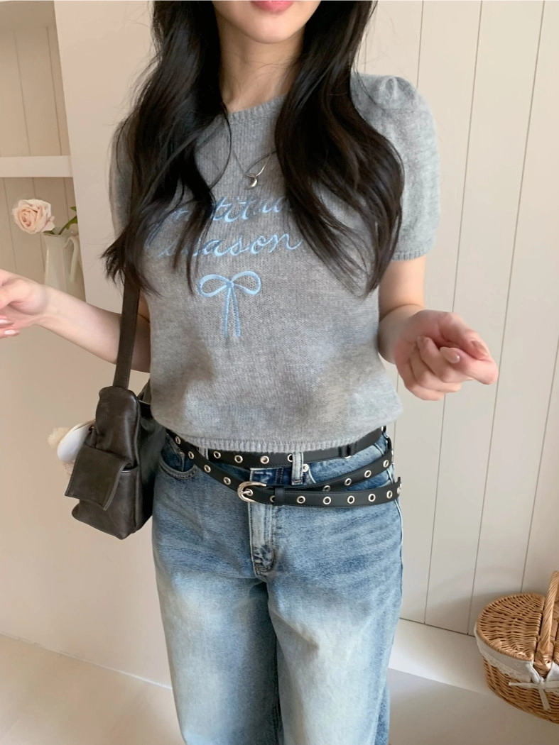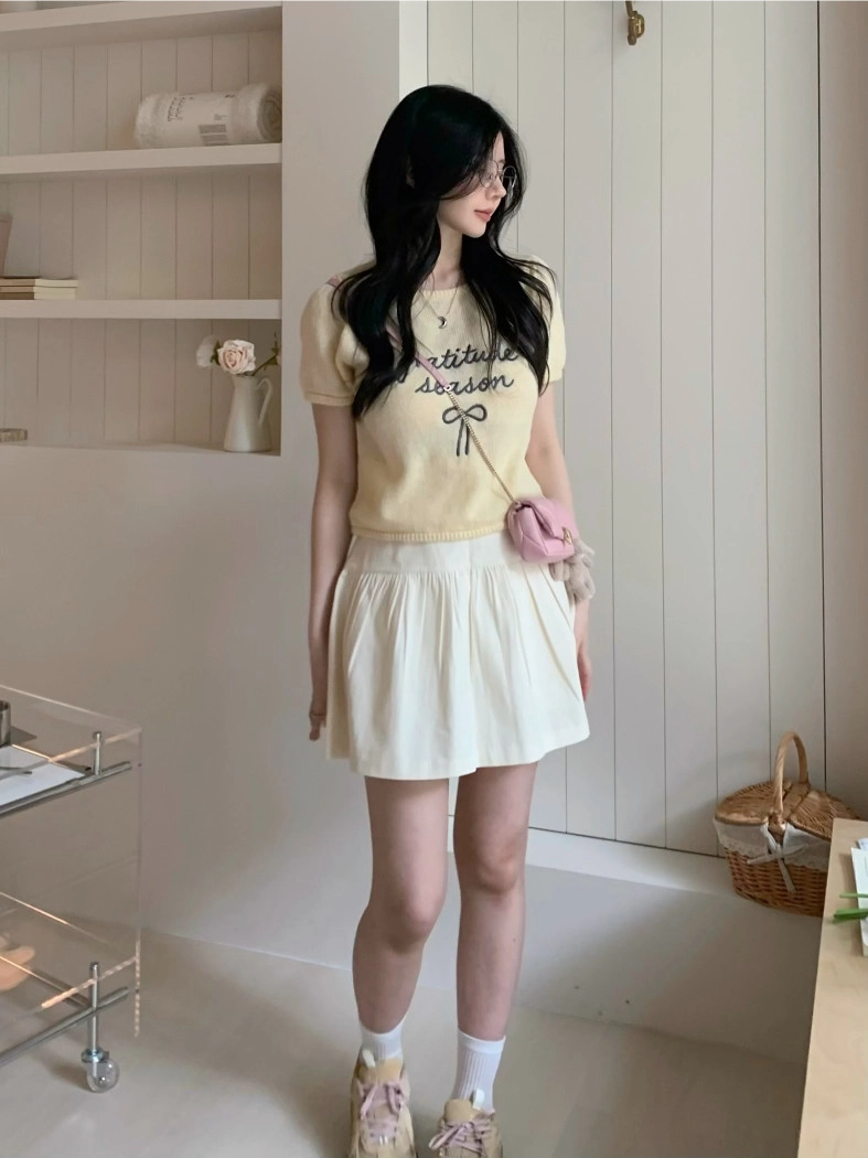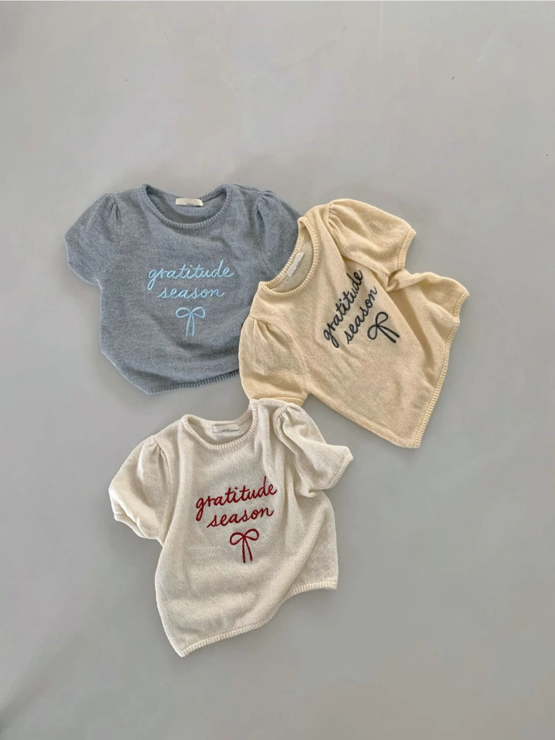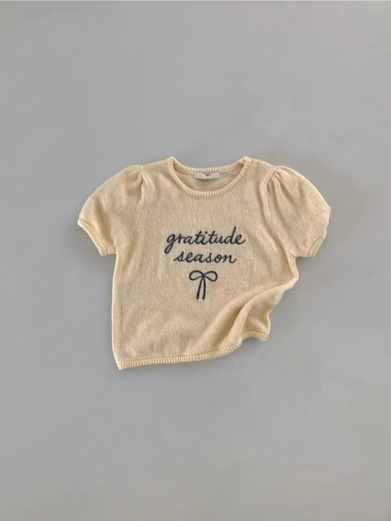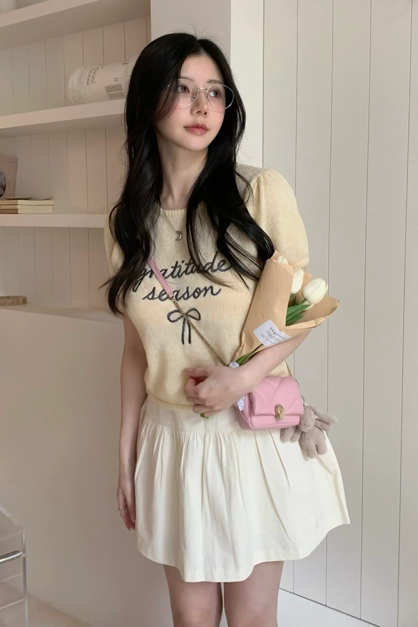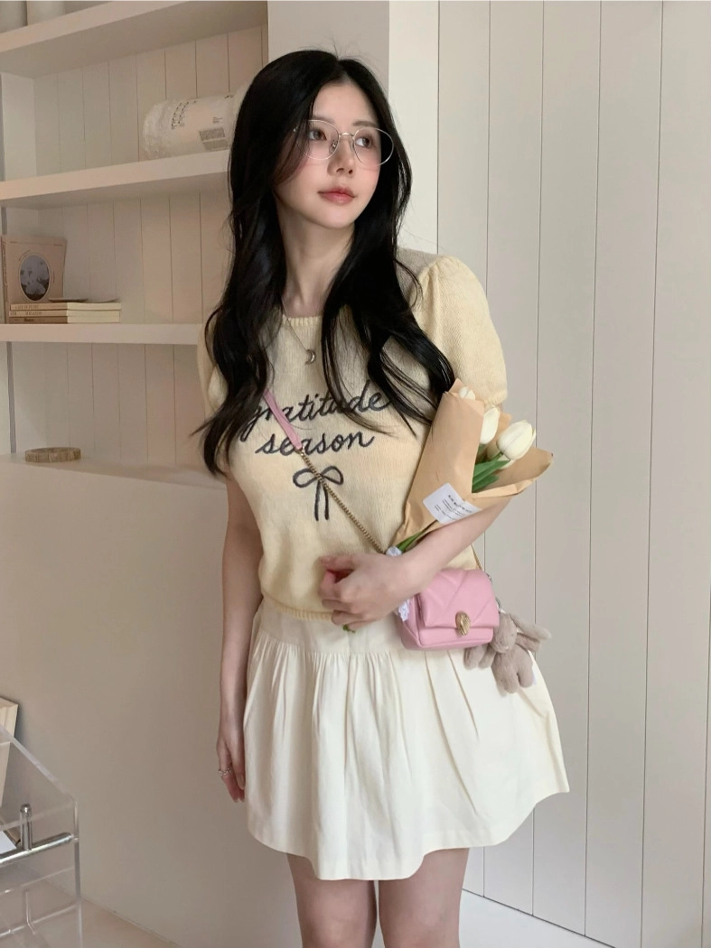超超可愛薄針織刺繡圖案短版上衣(米白/黃/灰)
