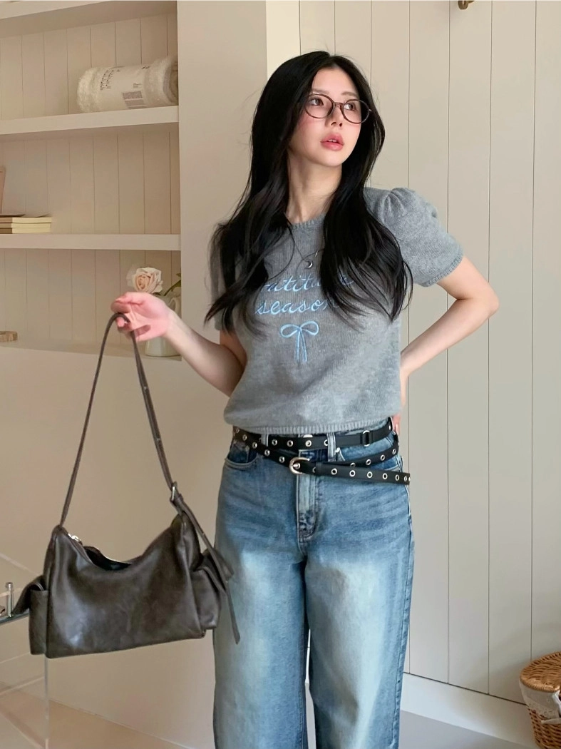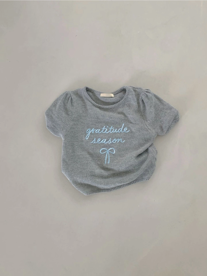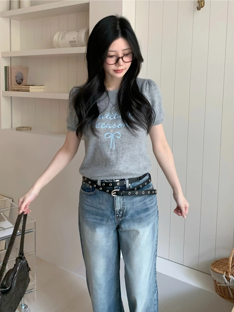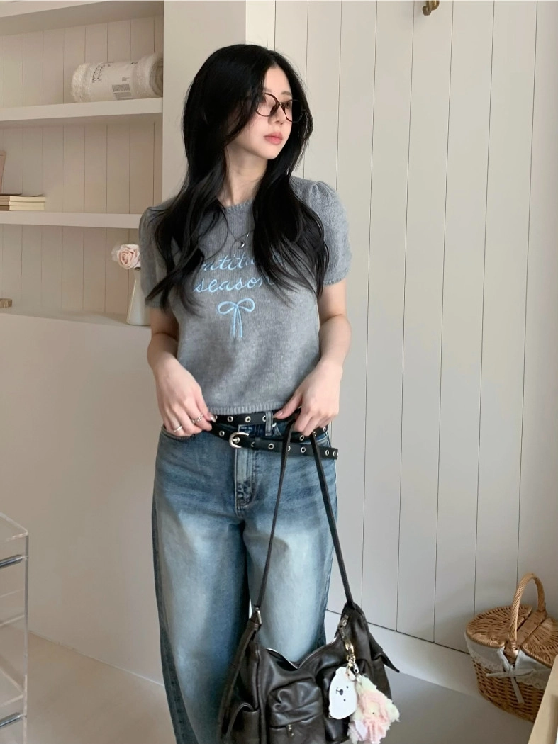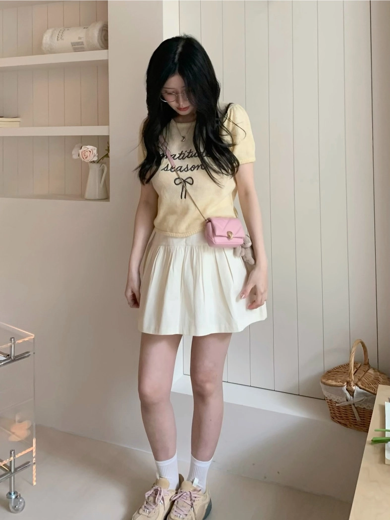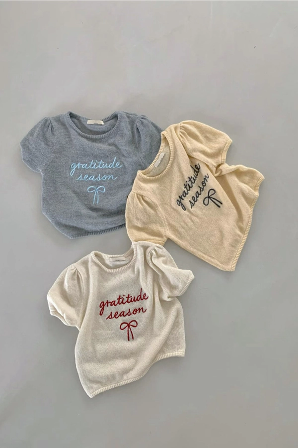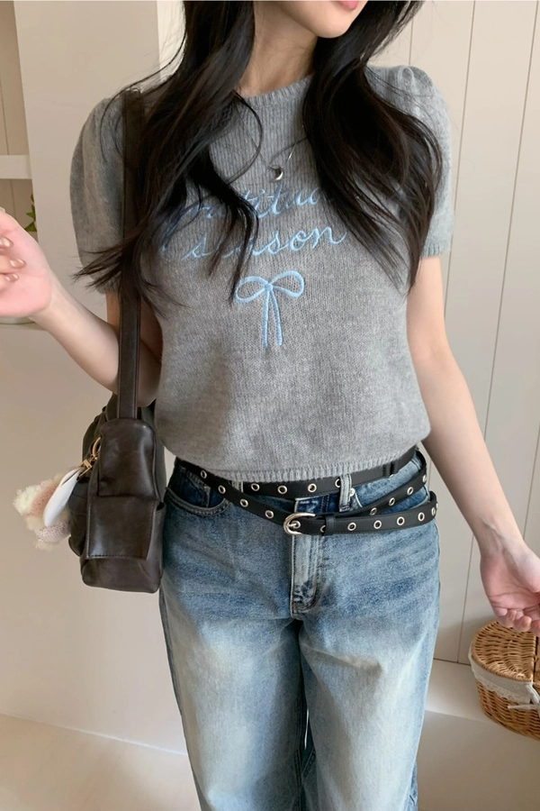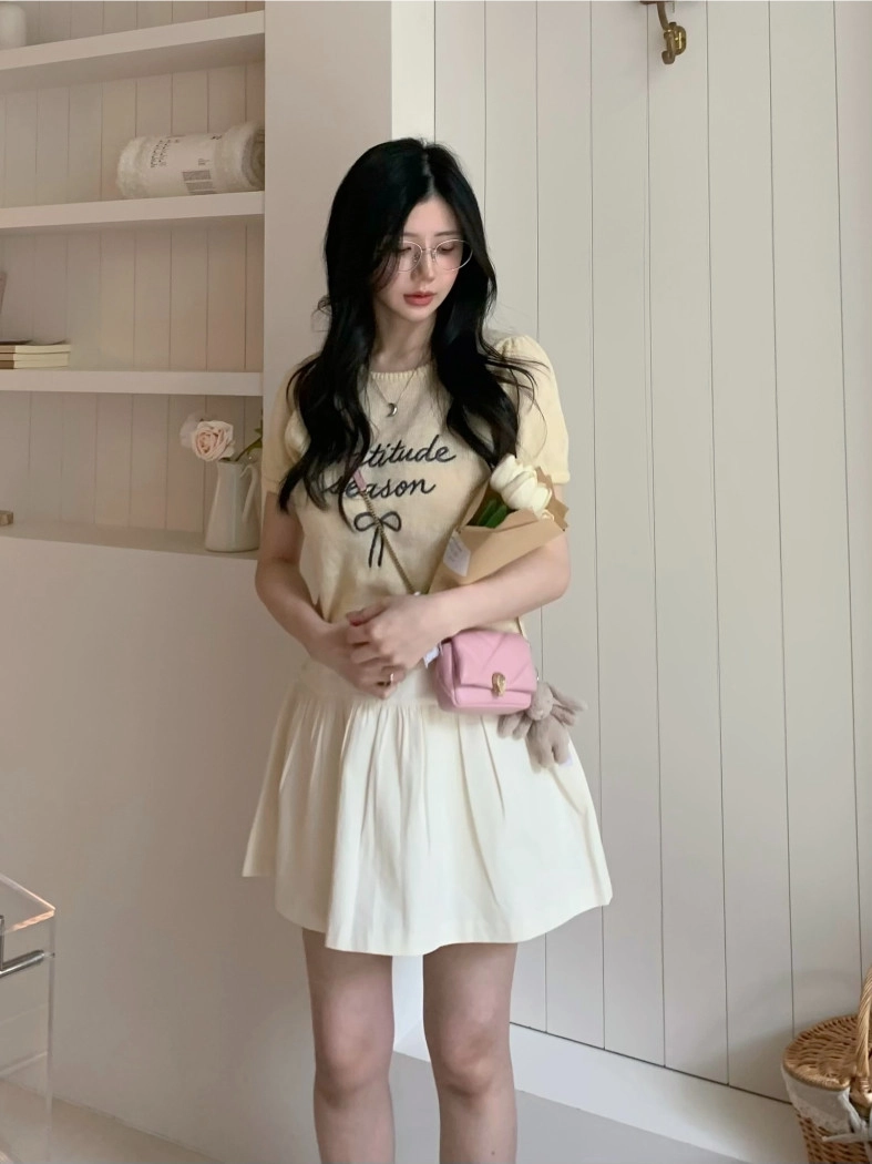 超超可愛薄針織刺繡圖案短版上衣(米白/黃/灰)